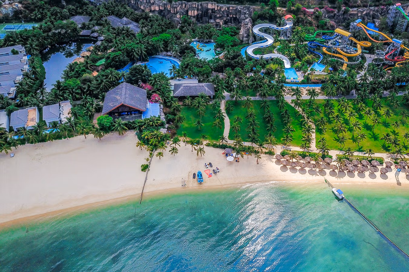 The beach offers crystal-clear water and soft white sand, making it an ideal place to relax after exploring the amusement park.