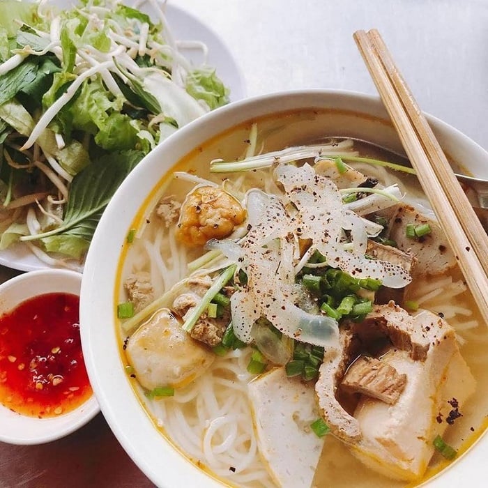 A local version of Vietnam’s famous Quang noodles, often served with fish cakes or boiled pork, featuring a light and naturally sweet broth.